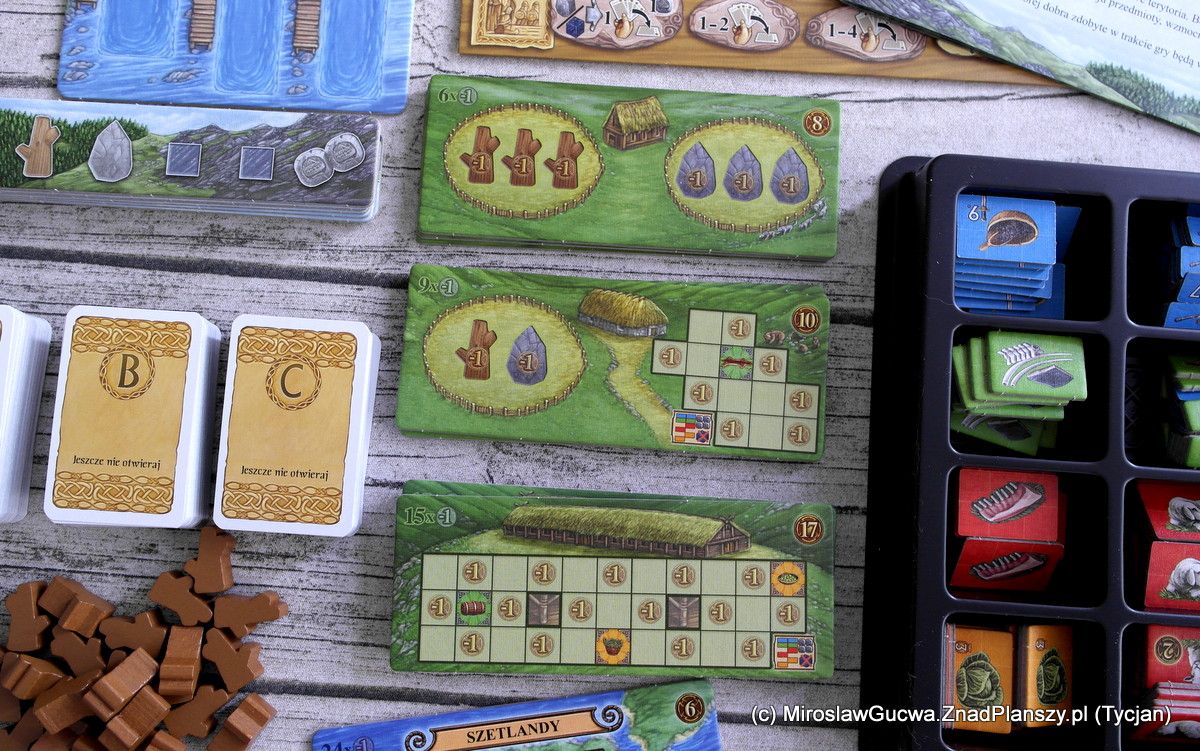 W dodatku dostajemy tutaj grę w grze, bo te nieregularne kształty żetonów żywności i przedmiotów nie są tu przypadkowe. Żetonami tymi musimy zabudowywać nasze plansze, zarówno te podstawowe, jak i później pozyskane, przedstawiające nowo wybudowane domy i podbite wyspy. To taki „Tetris”, a w świecie Rosenberga „Patchwork” podany w bardziej rozbudowanej formie, bo teraz nie tylko trzeba starać się zakryć wszystkie pola, to jeszcze warto pozostawić w nich odpowiednie pola odkryte, bo przynoszą one nam podczas gry różne korzyści. To naprawdę wciąga i jest wyzwaniem samym w sobie. Na nudę nie będziesz tutaj narzekał, bo w zasadzie przez cały czas będziesz coś kombinował.