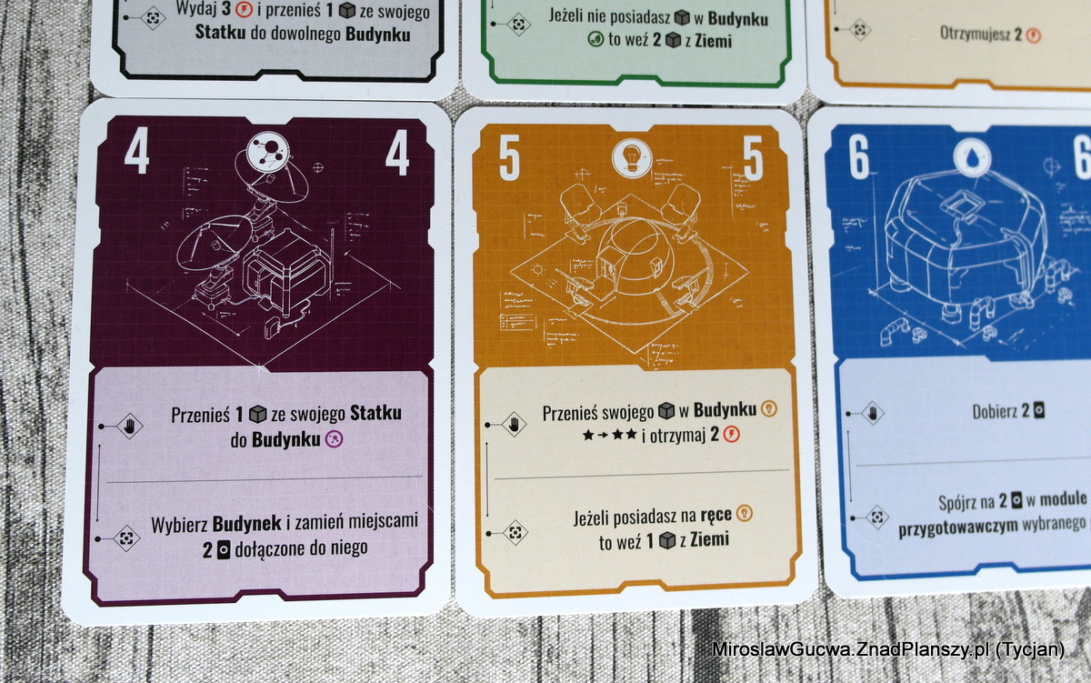 Budynki mają możliwości podobnego typu, więc nie będę o nich szerzej pisał. W zasadzie wszystko, co ci przychodzi do głowy, co można zrobić z żetonem, kartą i elementami pola gry, w którejś z akcji projektu lub budynku zapewne jest tutaj uwzględnione. Wszystko w jednym celu, aby przenieść wszystkich kolonistów z Ziemi do budynków i otrzymać za to punkty, albo przynajmniej starać się przenieść, bo oprócz punktów za kolonistów w budynkach, otrzymasz je za kolonistów na statku. Dodatkowo premiowane jest posiadanie kolonisty w każdym możliwym do zasiedlenia budynku, umieszczenie ich co najmniej czterech w jednym budynku oraz posiadanie najwyższego poziomu energii w statku.