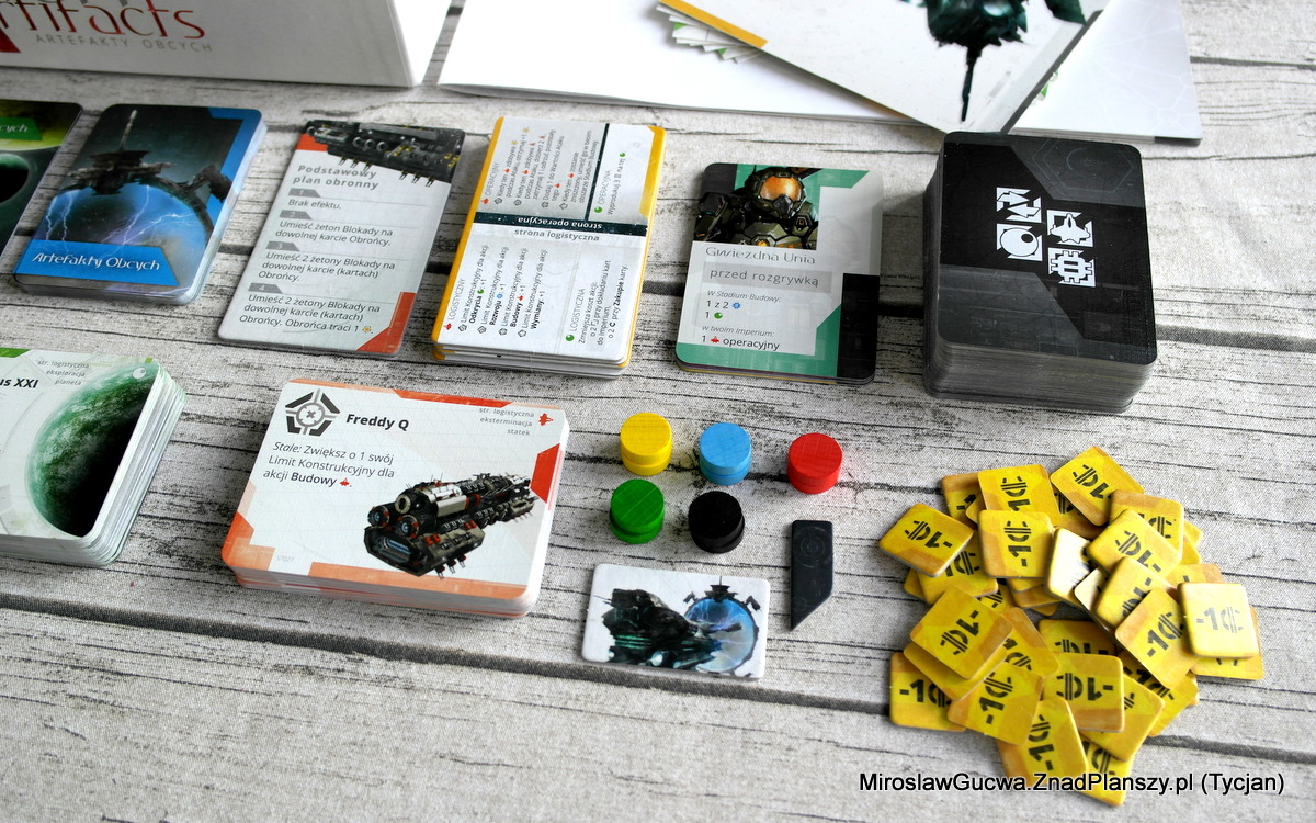 Jak już się pewnie domyśliłeś „Alien Artifacts” to gra karciana i wspomniane przed chwilą karty są głównymi komponentami gry. Czyli wszystko co w grze będziesz robił lub z czym będziesz miał do czynienia, przedstawione jest za pomocą kart. Kartami są nie tylko twoje zasoby, ale również Planety, Okręty kosmiczne, Technologie oraz związane z nimi „umowy” punktujące na koniec gry. Są jeszcze kredyty, za które kupuje się karty, ale są one wirtualne (wskaźnik na planszy gracza) i nie mają swojego fizycznego odwzorowania.