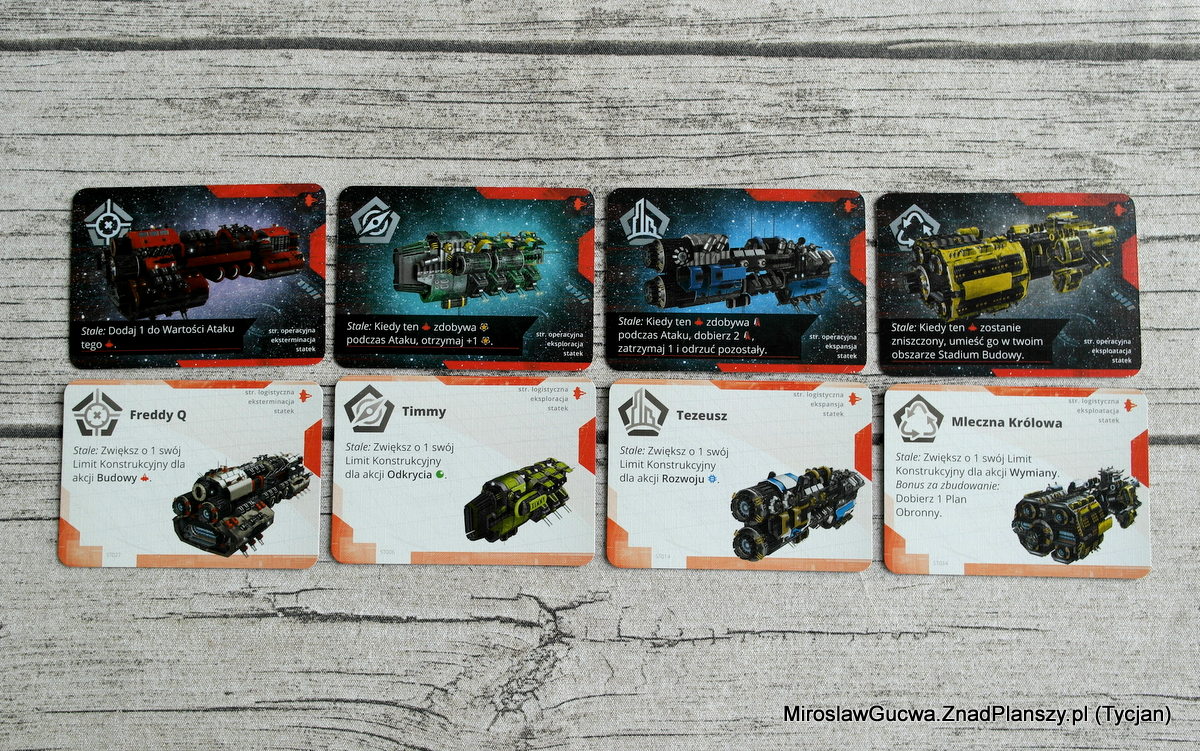 Statki wyłożone stroną widoczną na stosie dobierania (tzw. logistyczną) dają nam stałe ulepszenia związane z powiększeniem limitu konstrukcyjnego. Każdy rodzaj Statku podnosi inny limit. Druga strona karty, to Statki przeznaczone do walki, które w zależności od Rodzaju mają jedną z czterech specjalnych zdolności bojowych. Tutaj już nie ma takiej niepewności jak przy kartach Technologii, bo po symbolu łatwo można się zorientować, o jaką zdolność chodzi.