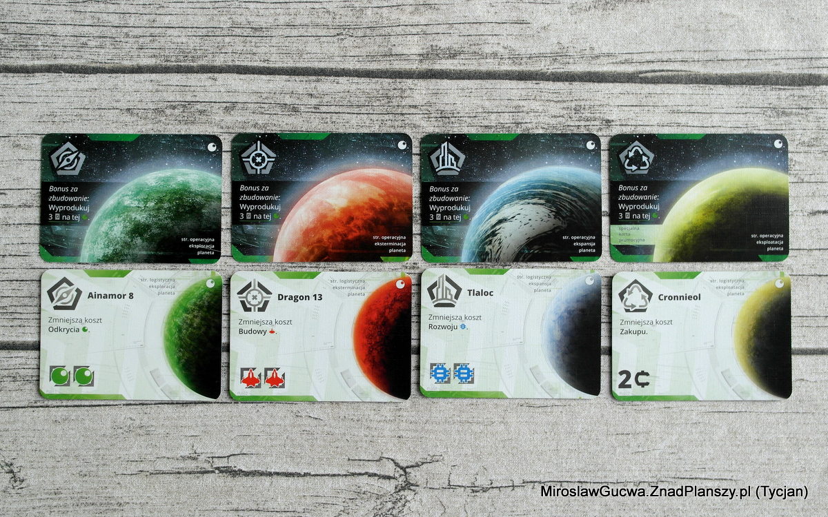 Pora podbić kolejne światy. W tym celu będziesz musiał wydać Zasoby zielone (i/lub złote) i tu też obowiązuje stawka początkowa pięć Zasobów plus jeden za każdą już odkrytą Planetę. Kartę Planety również możesz wykorzystać na dwa sposoby. Możesz taką Planetę zasiedlić i otrzymać za to trwałe korzyści w postaci zmniejszenia kosztów (redukuje liczbę wymaganych Zasobów) budowy Statków, rozwoju Technologii, odkrywania Planet, czy też zakupu kart; albo ją eksploatować i od razu wyprodukować na niej Zasoby. Nie jest to tylko jednorazowa produkcja, bo w grze istnieją mechanizmy, które pozwalają na jej powtórzenie.