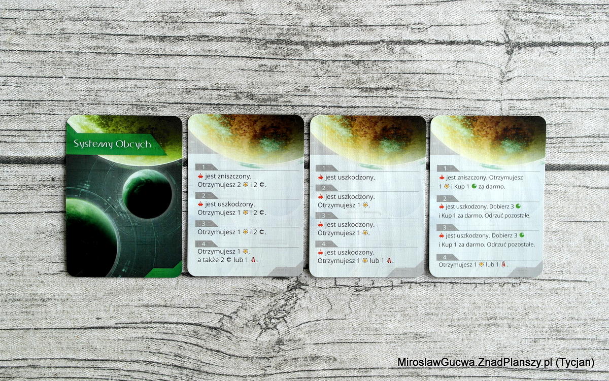 Do wyboru mamy trzy rodzaje kart: Planety, Statki i Technologie. Każda z nich jest dwustronna, a jej działanie będzie właśnie zależało od strony, którą za pomocą Zasobów aktywujemy. I tutaj dochodzimy do pierwszej problematycznej sprawy. Karty, jak przystało na typową grę karcianą, pojawiają się losowo w miarę zakupu kolejnych kart, a biorąc je z wierzchu stosu w ramach standardowej akcji zakupu, nie możemy podejrzeć co znajduje się po ich niewidocznej stronie. O ile w przypadku Planet i Statków nie jest to istotne, bo łatwo się tego domyślić po symbolu rodzaju, to utrudnione to jest w przypadku Technologii, które muszę teraz bardziej szczegółowo opisać, żebyś dobrze zrozumiał ten problem.