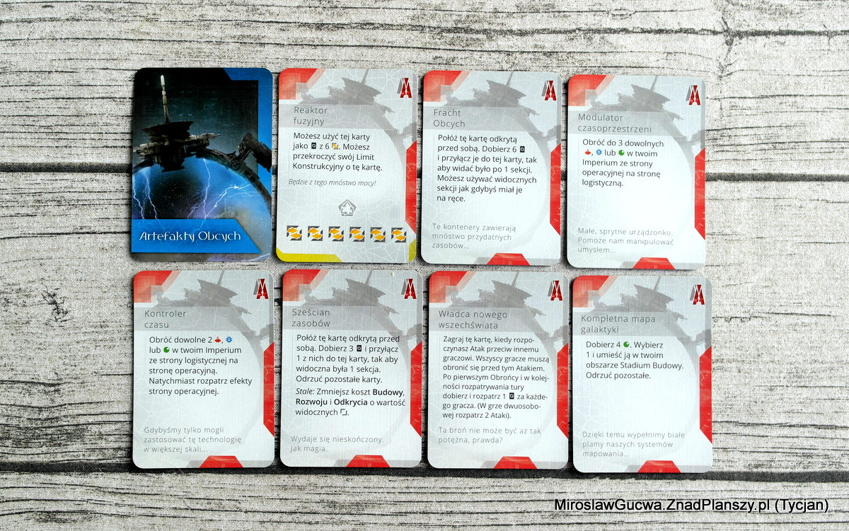 Po stronie widocznej znajdują się Technologie, które aktywne (tzw. wdrożone technologie) dają nam określone stałe lub dodatkowe specjalne zdolności/premie ułatwiające grę, zwiększające twoje możliwości i/lub pomagające zdobyć więcej punktów. Druga strona natomiast określa warunki zdobycia punktów nie tylko na koniec gry, ale również w momencie jej aktywacji (wyłożenia jako strony aktywnej w ramach sprzedaży technologii korporacjom). Ta niewiadoma związana z punktacją na początku dla osoby, która chce mieć pełną kontrolę nad grą jest strasznie irytująca i zrozumiem, że potrafi zaboleć i zrazić tych graczy, którzy cenią sobie trudne i wymagające gry strategiczne. Sam miałem z tym problem, ale po kilku grach, gdy ustawiłem sobie „Artefakty” w odpowiednim punkcie układu ciężkość/skomplikowanie – grupa docelowa – czas gry, to zaakceptowałem to, a co więcej, nauczyłem się jakoś z tym sobie radzić. Wciąż jednak nie potrafię sobie odpowiedzieć na pytanie dlaczego tę niewiadomą wprowadzono i/lub co zniwelowało ewentualne krytyczne głosy na ten temat osób testujących, których z tego co sam Portal powtarza, jest sporo. Zwłaszcza, że ta celowa niewiadoma nie jest za dobrze wdrożona. Każda Technologia ma swoją specyficzną nazwę, więc po jakimś czasie i tak każdy w końcu zapamięta, która karta co ma po drugiej stronie, więc po co ta tajemnica i początkowa niewiadoma?