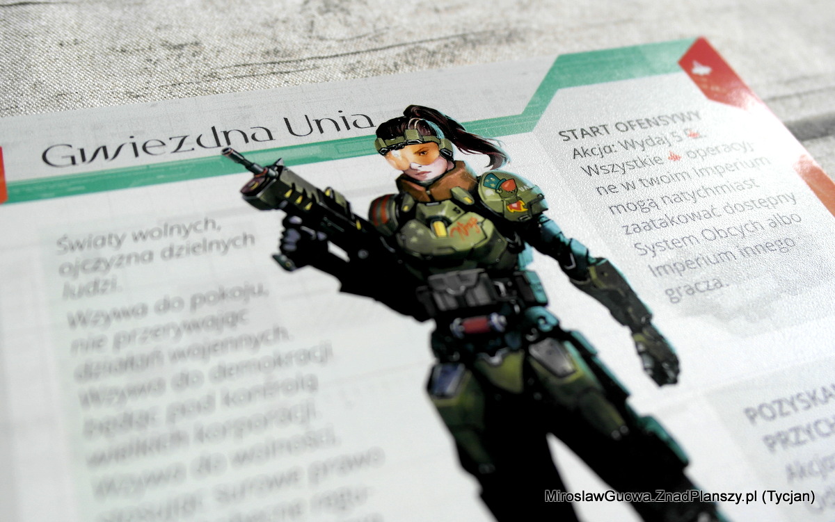 Gra po kilku rundach okazuje się dosyć prosta mechanicznie, ale niestety nie sprawia ona tego wrażenia podczas tłumaczenia zasad. Mam wrażenie, że niepotrzebnie wprowadzono tutaj poważne nazewnictwo, które na siłę wmawia nam, że mamy tutaj do czynienia z twardym science fiction. Padające zwroty Eksploracja, Ekspansja, Eksterminacja, Eksploatacja, limit konstrukcyjny w połączeniu z warunkami poszczególnych akcji, których jest tu sporo (jedenaście plus akcje z pozyskanych kart), niepotrzebnie komplikują tłumaczenie i mogą przytłoczyć nie tylko początkujących graczy. Ale tak jak napisałem, kilka rund i wszystko będzie jasne, tym bardziej że działanie wszystkich kart jest na nich opisane, a resztę uzupełni pomoc gracza.