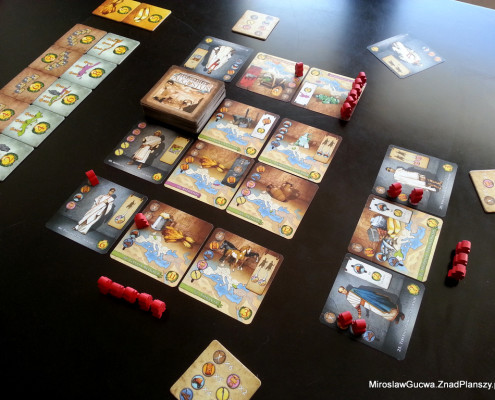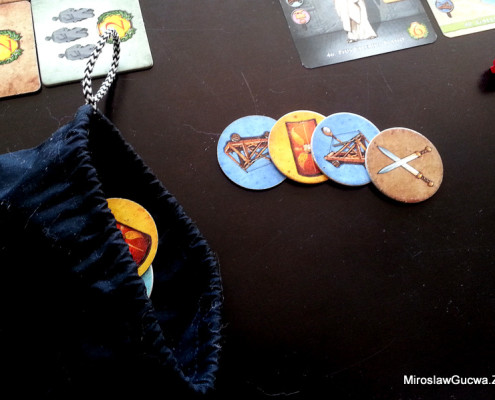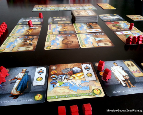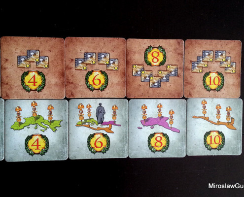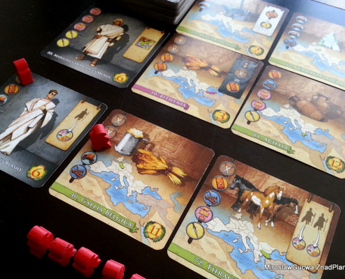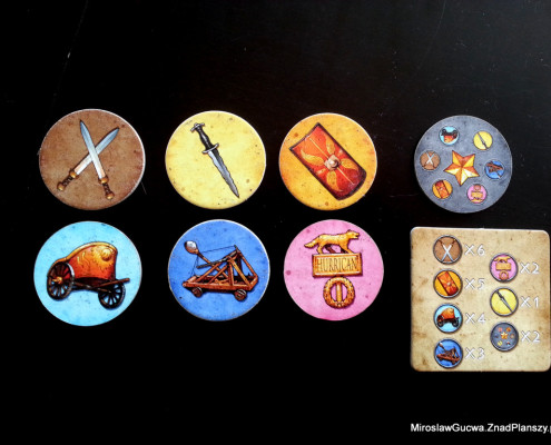 Po zamordowaniu Juliusza Cezara 15 marca, 44 r. p.n.e., jego adoptowany syn Gajusz Oktawian postanowił wrócić do Rzymu. Bardzo wcześnie ujawniły się jego ambicje polityczne…” OK, bez przesady. Odbieram Augustusa jako fajną grę, ale błagam, nie każcie mi w niej szukać klimatu. Tutaj go po prostu nie ma. Dostaniemy za to bardzo klimatycznie zilustrowane elementy gry, które faktycznie nawiązują do czasów potęgi rzymskiego cesarstwa. Zarówno dobre jakościowo karty misji, jak i żetony starają się nas przekonać, że jesteśmy „legati Agusti” (przedstawicielami Augusta), ale oprócz miłych wrażeń estetycznych klimatu nie tworzą. W Augustusie jednak nie o klimat chodzi, a jego siłą jest grywalność.