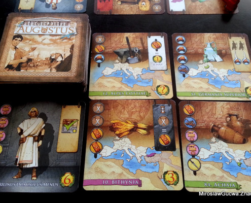 Jeżeli zastąpicie legiony markerem, a hasło Ave Ceasar! znanym wszystkim Bingo! to już zrozumiecie moje wstępne aluzje. Augustus na szczęście oprócz wspomnianych wcześniej zdolności misji dodaje do znanej mechaniki jeszcze kilka innych elementów, przez co gra nie jest monotonną procedurą „wylosuj i zaznacz”. Legiony w momencie wylosowania symbolu możemy brać z własnych zasobów lub przesuwać je z własnych, niezrealizowanych misji, przez co nie zablokujemy się w czasie ich realizacji. Dodatkowo, aby zachęcić nas do wyścigu w ich realizacji otrzymujemy możliwość zdobywania różnych nagród. Część zdobędziemy na zasadzie „kto pierwszy, ten lepszy”, część jest przechodnia (kontrola złota i pszenicy), ale najwięcej emocji wzbudzają nagrody przyznawane za liczbę zrealizowanych misji, gdzie musimy wybrać odpowiedni moment jej wzięcia, bo już nie będzie szansy wziąć innej tego typu – ani gorszej, ani lepszej.