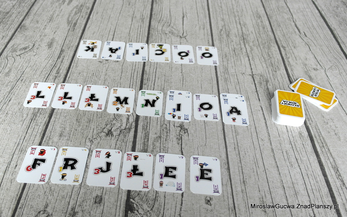 Gra wygląda niepozornie, bo to w zasadzie jedna talia kart, a w dodatku karty na pierwszy rzut oka mogą jeszcze zaskoczyć swoim rozmiarem. Jednak podczas gry spisują się bardzo dobrze i okazują się idealne. W dodatku każda z nich zilustrowana jest sympatycznym ninja, który został przyłapany na wykonywaniu czynności związanej z widoczną na karcie literą, która jest kluczowym jej elementem. Ilustracje są bardzo sympatyczne i na pewno szybko polubisz naszego słownego wojownika. Oprócz niego na karcie znajdziesz również wartość punktową danej litery, kolor oraz liczbę jej kopii w talii. Całość prezentuje się przejrzyście oraz bardzo kompaktowo, więc nie powinno być problemu z zabraniem gry w każde miejsce, bo pudełko/woreczek z kartami zmieścisz wszędzie. Wrzucona w tajemnicy np. do przepastnej damskiej torebki jest niezauważalna, zarówno wagowo, jak i rozmiarowo. Test ten przeprowadziłem osobiście… na Moni.