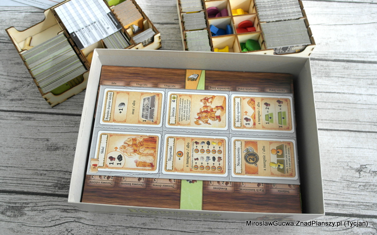 Na podstawie tego co otrzymałem mam wrażenie, że można je podzielić na dwie grupy. Pierwsze faktycznie mocno pomagają przy organizacji komponentów podczas gry, jak również poza nią. Tutaj przykładem tego jest organizer do „Kawerny”, który pozwala zapomnieć o miskach i miseczkach wokół planszy oraz umożliwia o wiele szybsze przygotowanie gry do rozgrywki niż stosowanie standardowych woreczków startowych.