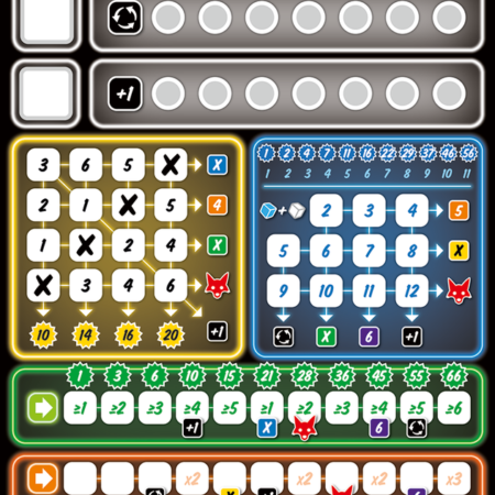Obszary. To meritum tej gry. Wartości na wybieranych kościach skreśla się w odpowiednich obszarach zgodnie z ich wymogami i to one są źródłem zdobywanych punktów. Żółte i niebieskie pole w każdej grze wymaga takich samych wartości na kościach. To pierwsze punktuje za wykreślone w całości kolumny, ale daje specjalne bonusy za wiersze i przekątną, natomiast w niebieskim polu liczy się liczba skreślonych liczb, a bonusy aktywują się po zakreśleniu zarówno wierszy jak i kolumn. Ten obszar ma jeszcze jedną specjalną własność, ponieważ skreśla się tu zawsze sumę wartości kości niebieskiej i białej, niezależnie czy wybierzesz białą, czy niebieską i czy jakaś z tych kości była już odrzucona lub zużyta. Zawsze liczy się suma. W zielonym obszarze otrzymasz tym więcej punktów im więcej wpiszesz tu cyfr, ale muszą one spełniać wymogi „większy-równy” dla kolejnych pól. Podobne wymogi ma obszar fioletowy, tylko tutaj trzeba wpisywać coraz większe liczby z pewnym wyjątkiem, ponieważ istnieje reguła, która mówi, że cyfry jeden – pięć są większe od sześciu. Tym samym nie zablokujesz się w czasie gry wpisując gdzieś na początku szóstki. Do obszaru pomarańczowego wpiszesz każdą cyfrę, ale warto te najwyższe wartości wpisywać w pola z mnożnikiem, ponieważ w tym obszarze oraz w fioletowym na końcu otrzymuje się punkty wynikające z sumowania wszystkich wpisanych w nie cyfr. W trzech ostatnich obszarach podobnie aktywują się bonusy.