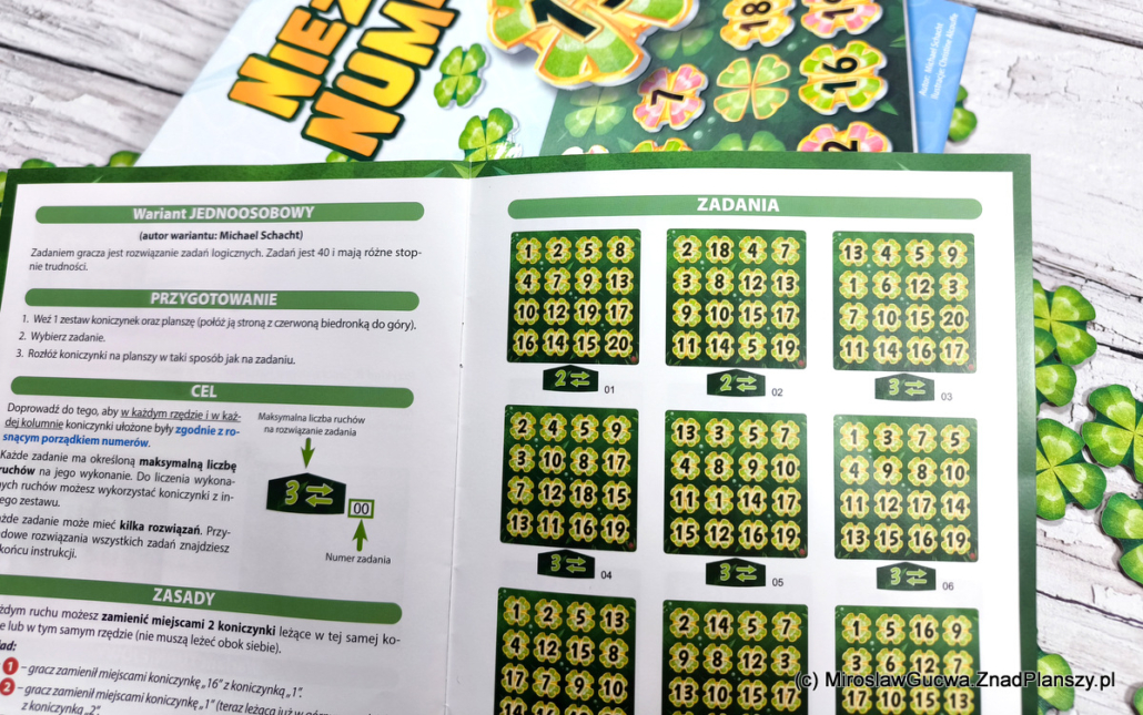 Na rozwiązanie zadania mamy podaną maksymalną liczbę ruchów, a sam ruch polega na zamianie miejscami dwóch koniczynek. Rozwiązania zostały podane w instrukcji, ale każde z zadań można rozwiązać na kilka różnych sposobów, więc bez problemu można do nich wracać.