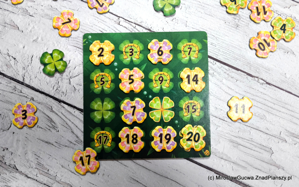 W tej grze nie możesz skupić się wyłącznie na swojej planszy. Znajomość tego, ile koniczynek o danym numerze znajduje się w puli, sprawia, że równie ważne staje się obserwowanie układów innych graczy. To, co pojawi się na ich planszach, znika z puli i nie będzie już dla nas dostępne.